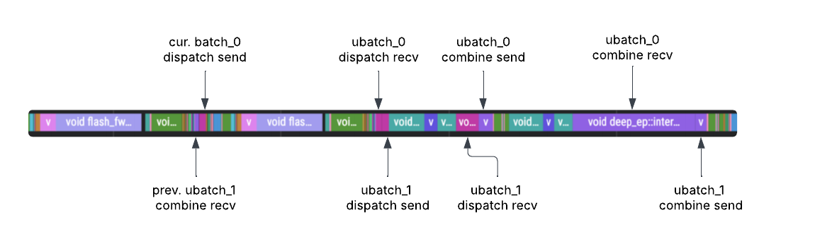 vLLM has integrated support for DeepSeek’s microbatching strategy as dual batch overlap (DBO), available via --enable-dbo flag from the command line. This strategy overlaps compute and collective communication to increase GPU utilization. In particular, vLLM implements this as follows: